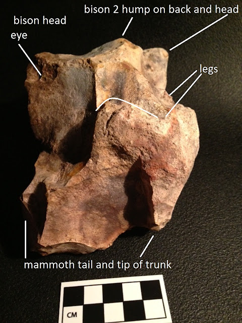 The mammoth/bison combination sculpture from 23JP1222 featured in the previous posting has been interpreted to also depict a feline face and egg form visually integrated into the mammoth's head. The mammoth's ear may also be interpreted as an egg form here and a feline face was worked onto a reddish component of the flint. The cat's face is circled here and possible ears/crack in egg highlighted.